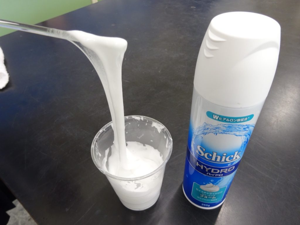 参加申し込みをされた方から「マシュマロスライム」のリクエストがありました。早速、シェービングクリームを買ってきて部活の中で作ってみました。