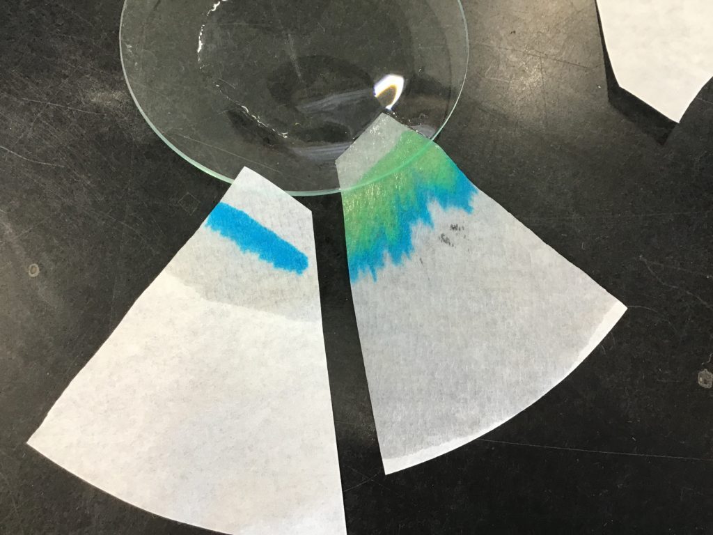 下の写真は水性のサインペンのインクを水でにじませたものです。ペーパークロマトグラフィーと言ってインクの色を成分に分けることができます。