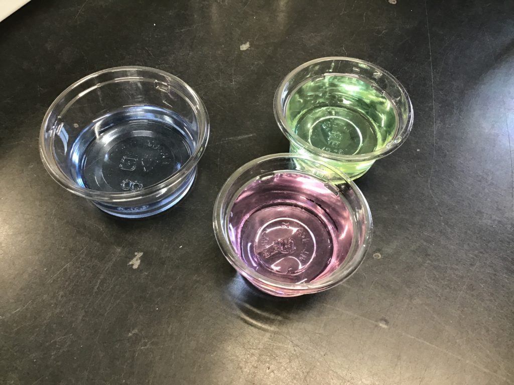 ハーブティーのマロブルーでお茶を入れ、塩酸や水酸化ナトリウムを入れて色を変える実験をしました。リトマス試験紙と同じように酸性やアルカリ性で色が変化します。