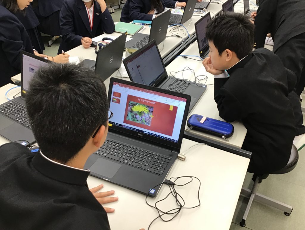 今日のテーマは、「江陽中学校の植物」です。タンポポやカタバミなど、校内で観察できるいろいろな花を調べてまとめました。
