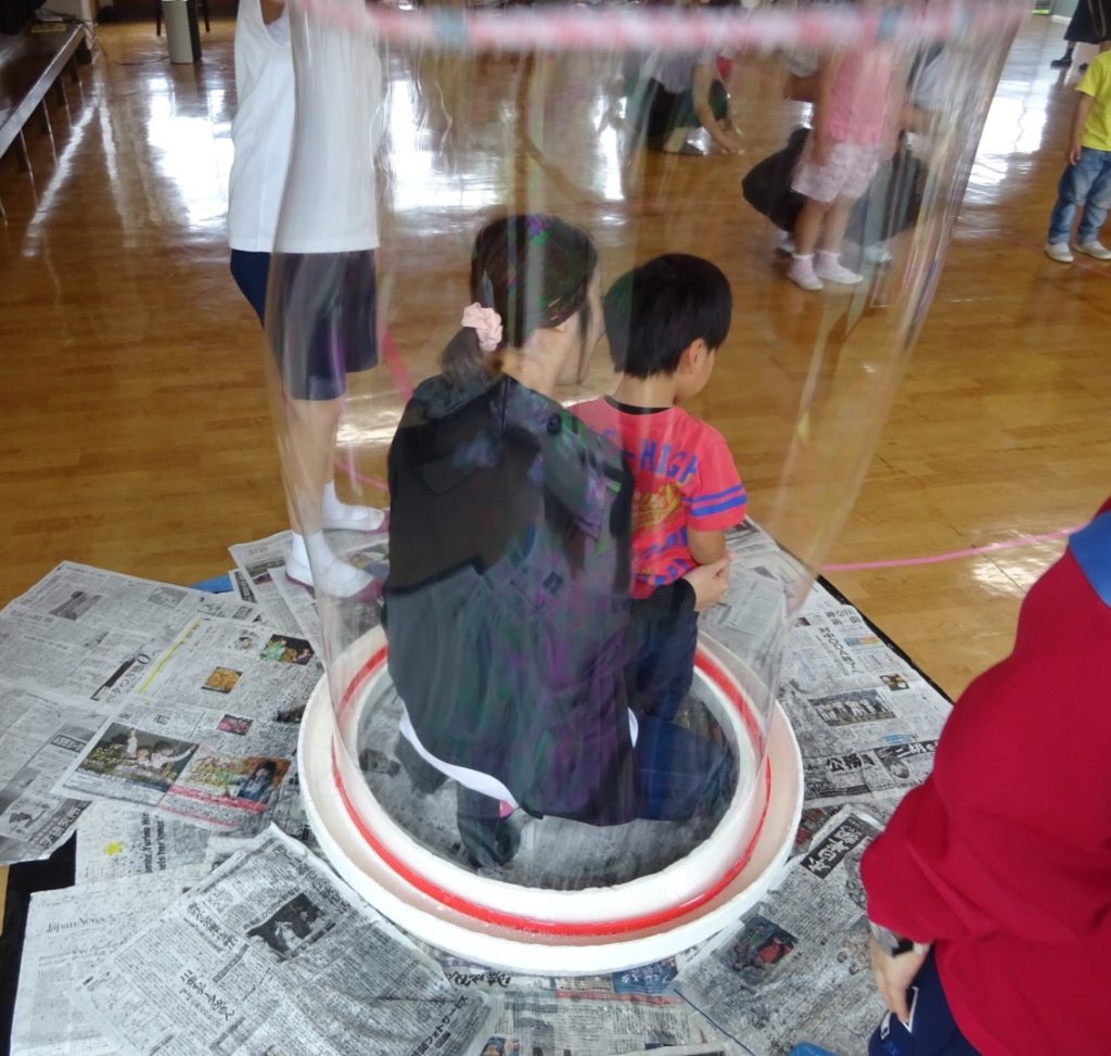 ホールでは、人が入る大きなシャボン玉をやりました。小さなお子さんは親子で入りました。