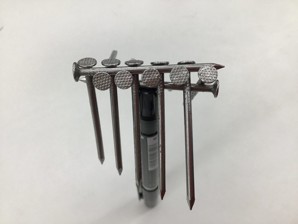 接着剤は使っていません。ただ、釘を並べてから、中心の釘を持ち上げるだけです。ちょうど釘が斜め下向きになるので、重心が支点の下になるのですね。