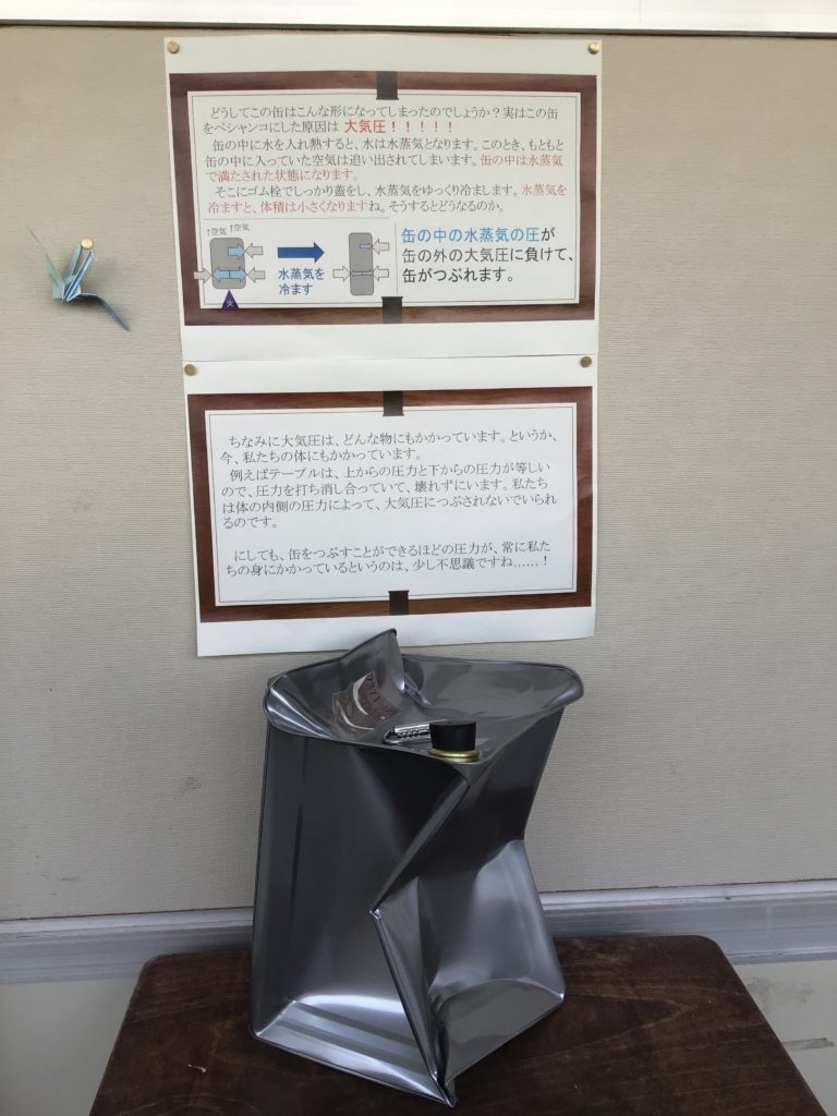缶がつぶれたのは? 部員が廊下に置いた缶がどうしてこんな形になったのか、分かりやすく解説を作りました。 大気圧は丈夫な缶をつぶすことができるんですね。 By asaitou | 2020年12月12日 | 校内の活動 | ← カイロと結晶作り 尿素の結晶づくり →