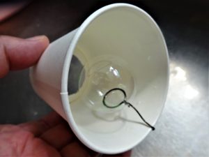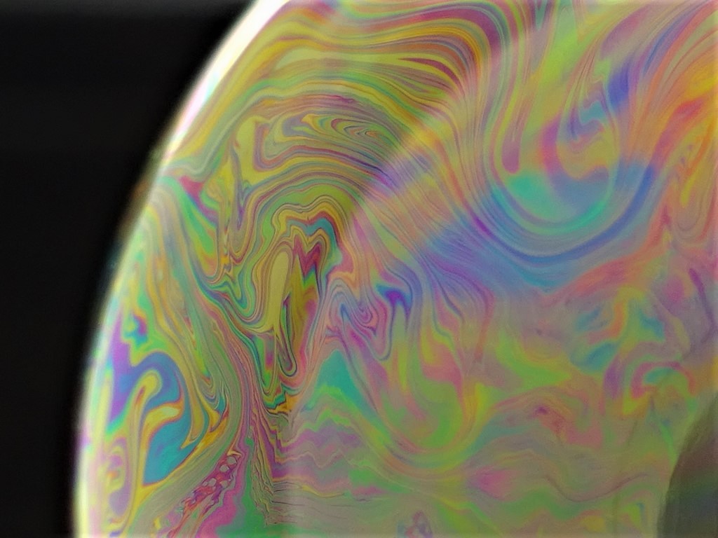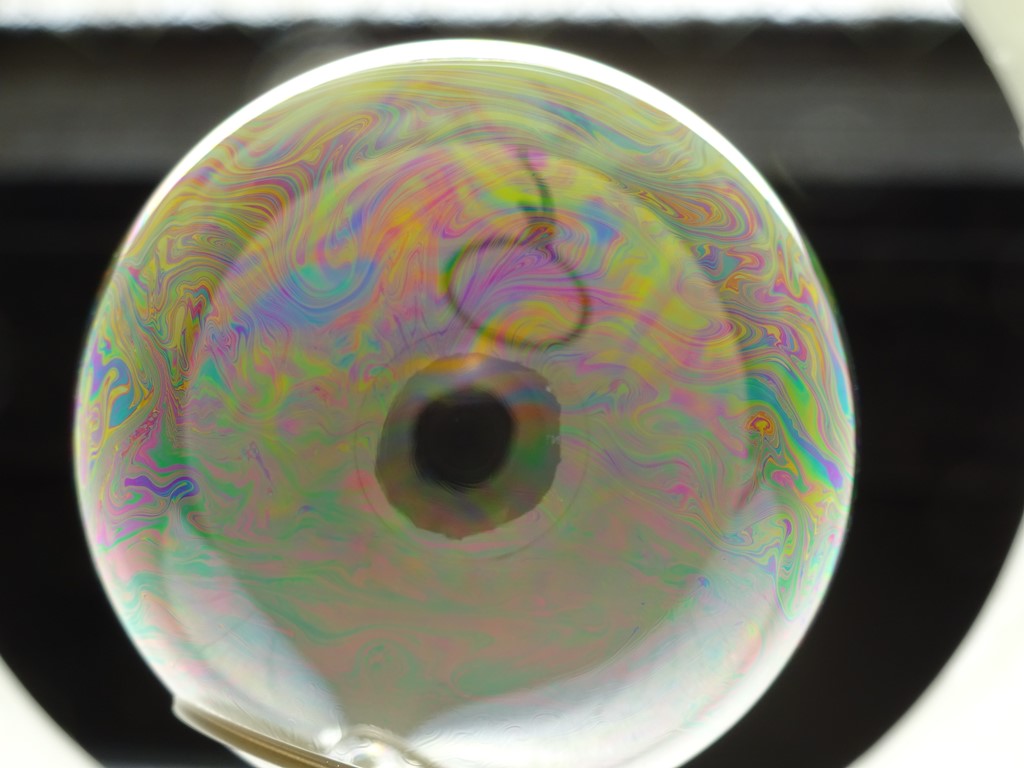 底を抜いた紙コップの中に小さなシャボン玉を動かないように固定し、紙コップの内側の紙をライトの光で照らし、穴を開けたコップの底の方からシャボン玉を観察しました。上の写真はこの一部を拡大したものです。こうして観察すると、コップの白い色がシャボン玉の膜で反射して綺麗な虹色に見えるのです。このとき、シャボン玉の奥に黒い紙があると色が鮮やかに見えます。